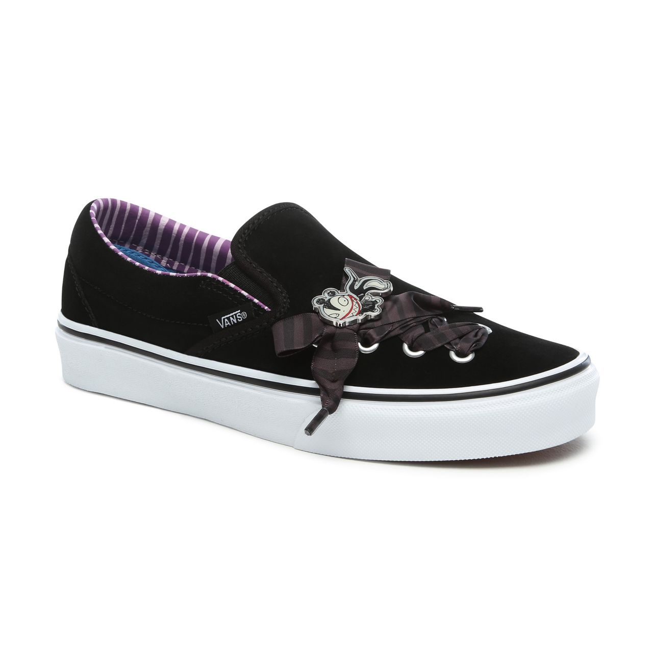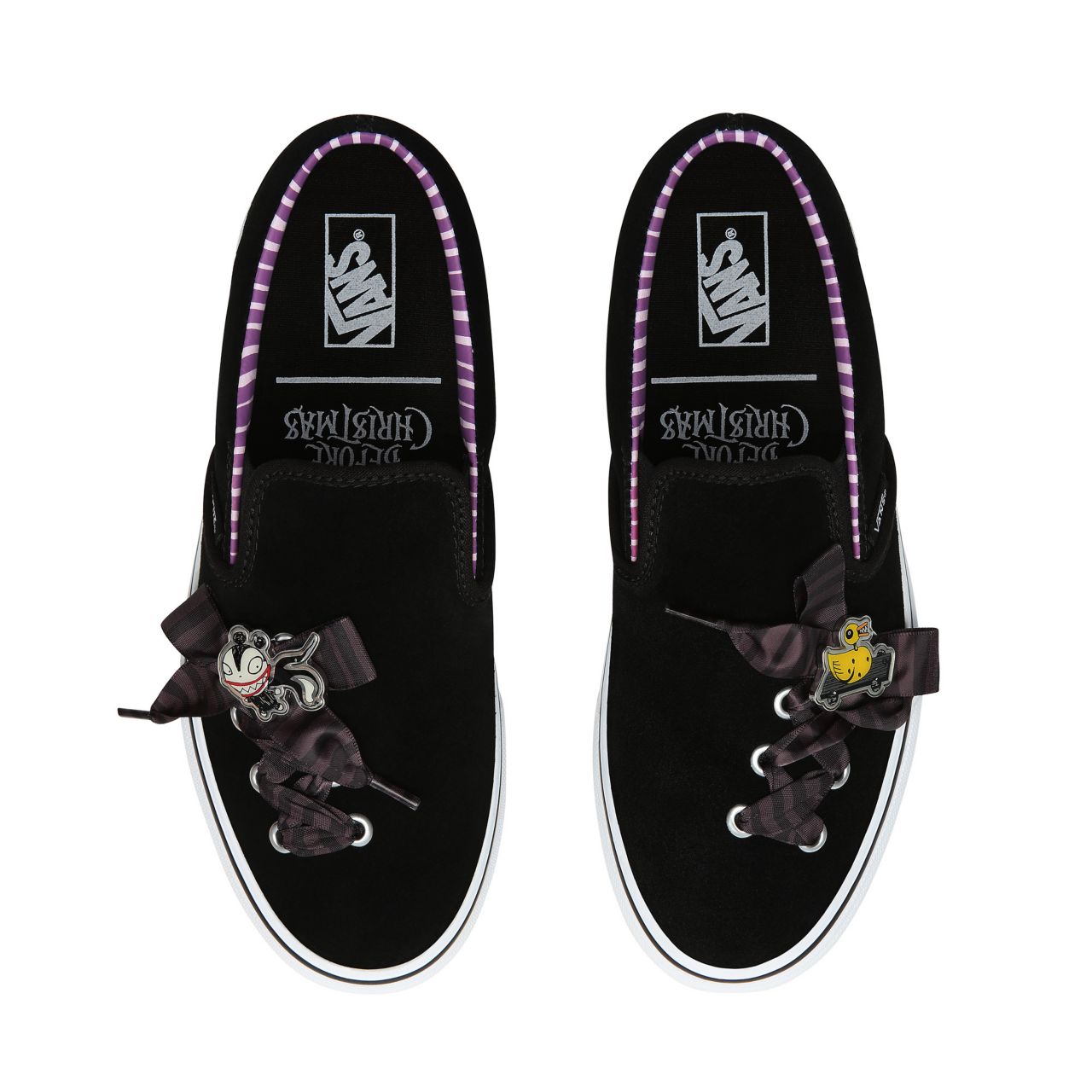 Step into imagination with the characters and the creative spirit of The Nightmare Before Christmas in this new Off The Wall collection. Celebrating Tim Burton’s iconic film, the Nightmare Before Christmas Classic Slip-On Lace features sturdy low profile slip-on suede uppers with custom laces and hardware inspired by the Haunted Toys. It also includes padded collars, elastic side accents, and signature rubber waffle outsoles.
