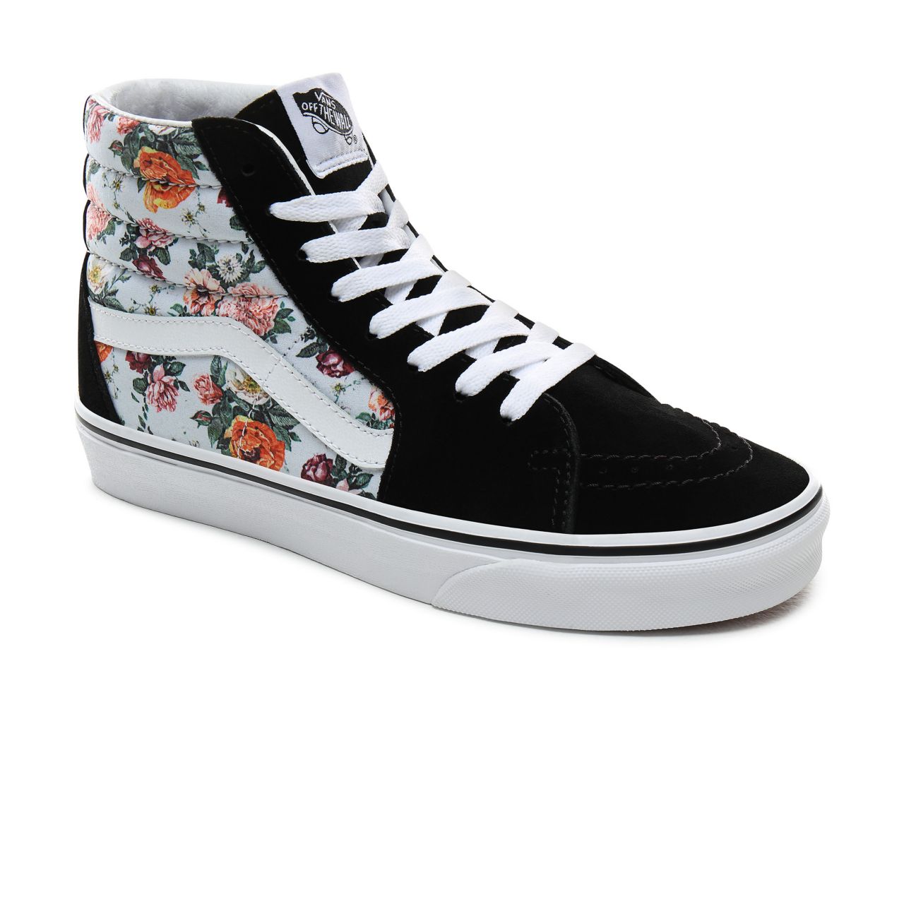The Garden Floral Sk8-Hi combines the legendary lace-up high top with printed textile and suede uppers, re-enforced toecaps to withstand repeated wear, padded collars for support and flexibility, and signature rubber waffle outsoles.